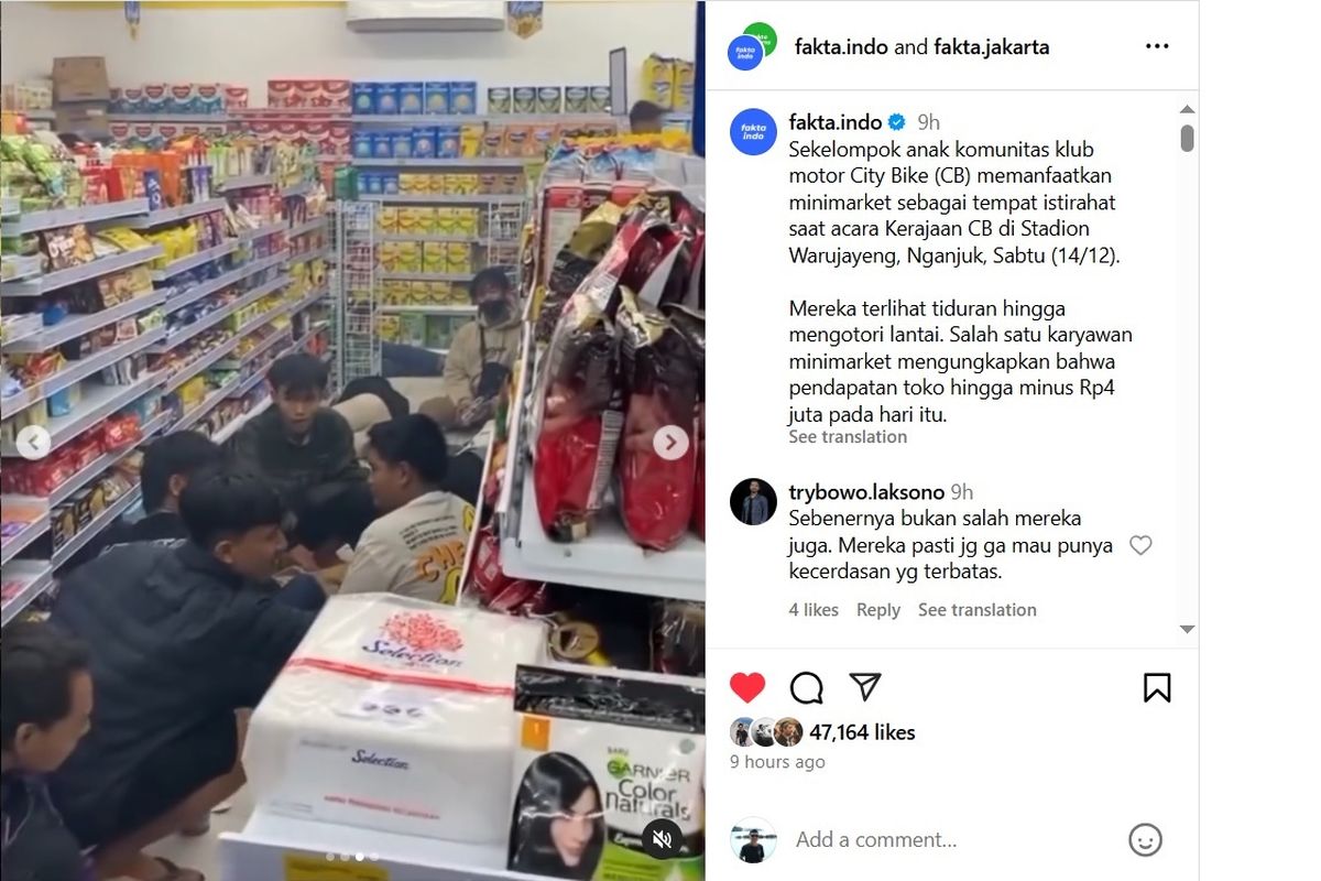 Aksi klub motor CB yang memasuki minimarket secara serentak ini menjadi viral dan menuai berbagai reaksi dari masyarakat. Meskipun tujuannya adalah untuk menunjukkan solidaritas kepada pemilik minimarket yang mengalami kerugian, aksi ini juga menimbulkan perdebatan tentang bagaimana cara yang tepat untuk menunjukkan solidaritas tanpa mengganggu ketertiban umum. Semoga aksi semacam ini bisa menjadi inspirasi bagi banyak orang untuk saling mendukung dalam situasi sulit, namun tetap dengan cara yang bijaksana dan tidak mengganggu ketertiban umum.